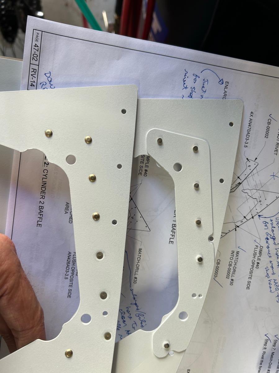 I decided I could proceed with riveting without any new tools, but I am hoping to get a 12” back rivet set to use on the C-frame (back-ordered at Cleaveland), and maybe a few other longer rivet sets also (like 12” long round head for 3/32” and 1/8”). Other than a few nutplates on the air filter frame, this was the first really significant amount of riveting I’ve done for a while. And I was definitely out of practice. And while a lot of the rivets could be easily squeezed, there were quite a few that had to be bucked with the gun, and with various attachments like double-offset. A few had to be drilled out and replaced. So, it took a while, but I finished one of the major baffle assemblies, and I think there are three or four more to go. After finishing the baffle assemblies, next up is surgery on the prop spinner and backplate. Then maybe some stuff in the finishing kit, while still waiting for wing and fuse. Off to Colombia tonight for Martin’s wedding!