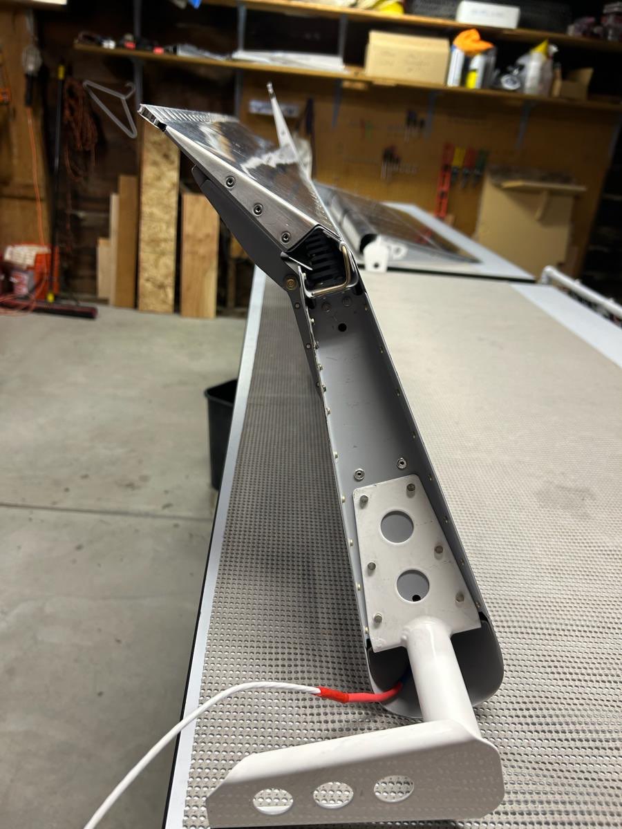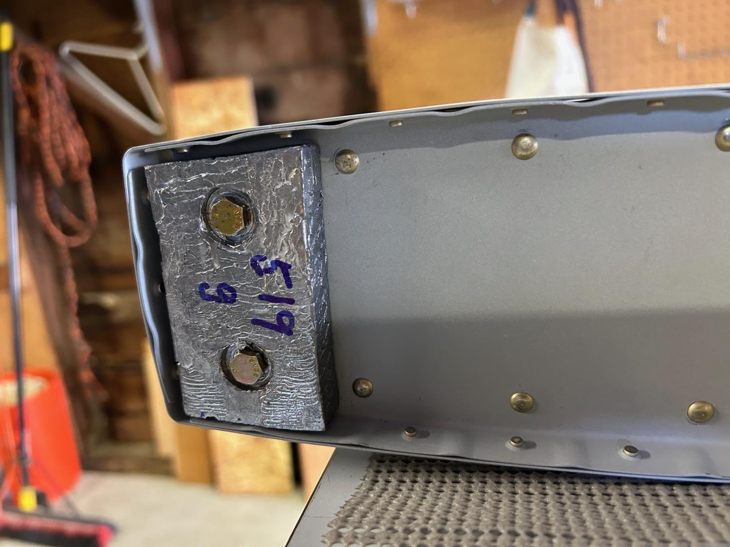 Feb 17-19, 2024 In the last entry, we declared victory on finishing the elevators, but there were still a few finishing touches to go, such as final trimming and mounting of the counterweights, and also testing and installing the pitch trim servo. It was satisfying to apply 12V power to the trim motor and watch it move the trim tab. It’s quite noisy, but I’m sure we won’t hear it with the engine running. It’s a bit surprising how the trim tab deflection is MUCH greater in the pitch-up direction that pitch-down, but it seems correct compared to others I have seen. The lead weights required lots of trimming and shaping to get them to fit. I cut off the wrong end of one of the counterweights, which made the mounting holes off-center and unusable! So, I poured molten lead into the original holes, and then drilled new holes in the right locations. Painful, but kind of fun! The elevators will get final balancing later, after they get painted, and so some additional weight may need to be added, especially on the left elevator that has the extra mass of the trim servo. On to the tailcone next!