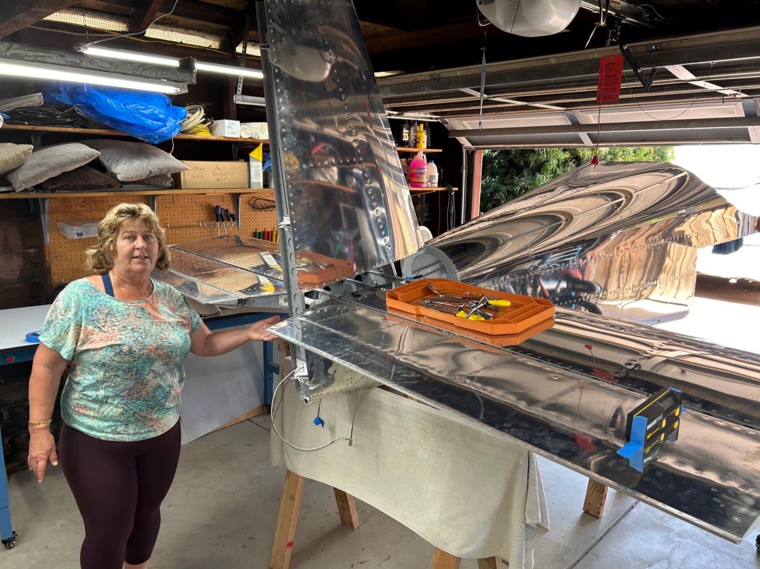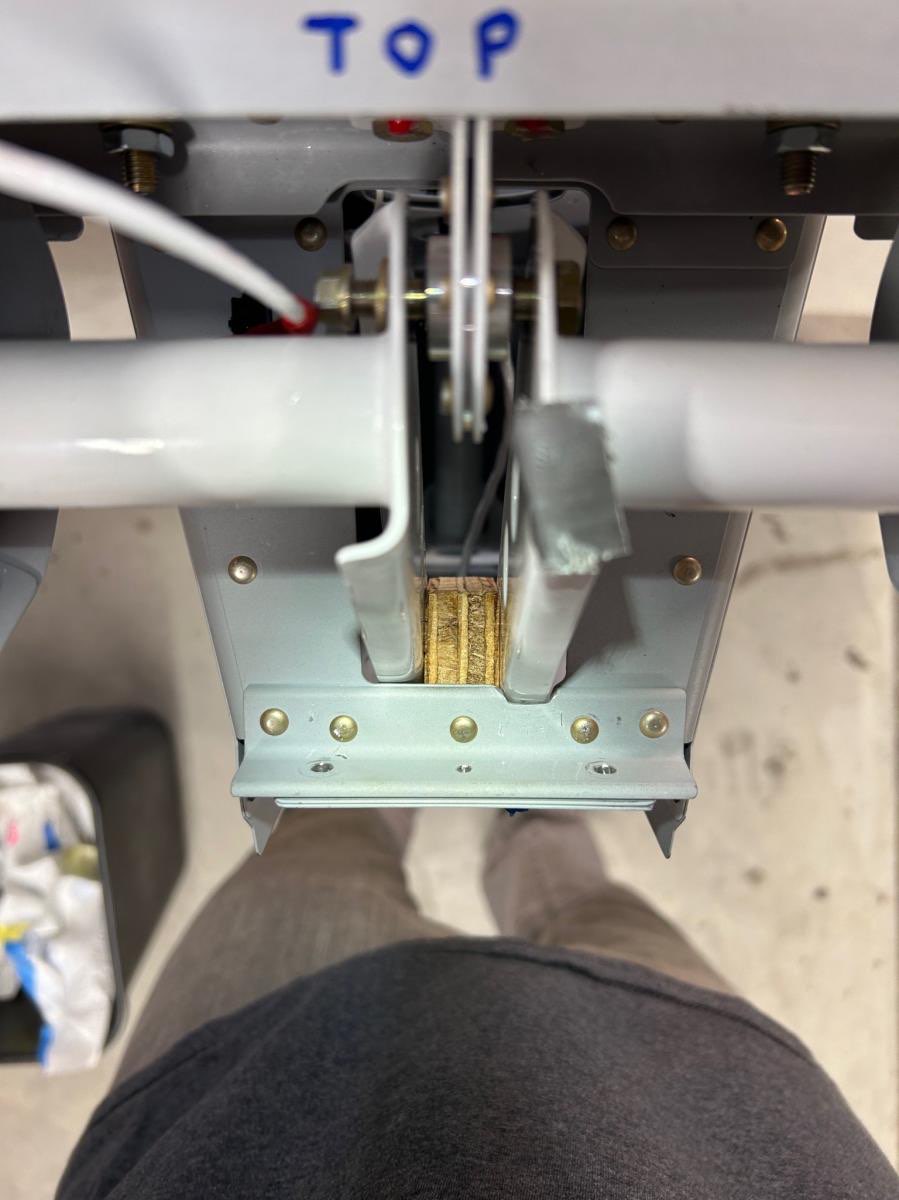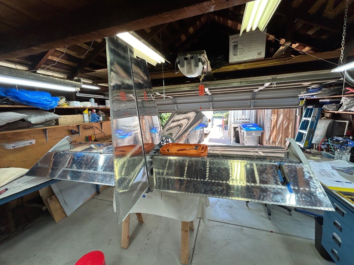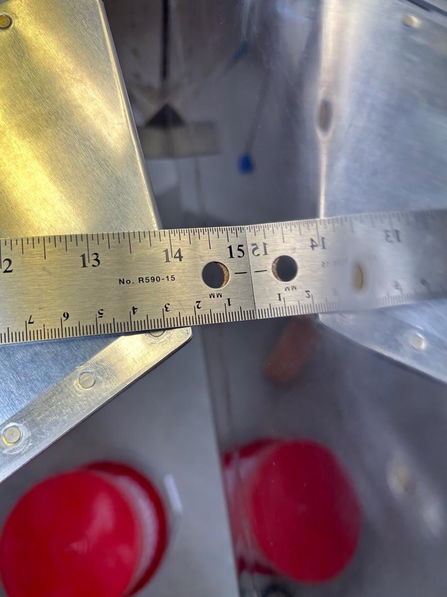 June 5-11, 2024 HS attach - needed to drill some holes to 1/4” final size, and the lower holes couldn’t be reached with my drilling gear. Paul Mantegna pointed out that I could make a drill extension using threaded-shank bits, using our threaded deburring extension. I had everything needed, but for large threaded drill bits, which I borrowed from Andrew Clark (and then ordered my own). The job went easily with the right tools, as usual! VS attach - this was easy since the holes were all drilled already, just needed to bolt it in place (I used temporary wing nuts and steel bolts, to not wear out the real lock nuts. With HS and VS properly mounted, this led to the most satisfying part of the build so far, which was hanging the rudder and elevators, and seeing the whole tail of the airplane in nearly final shape! It also allows measuring and adjusting control surface deflection, and checking that the rudder stops prevent the rudder and elevator from colliding with a safe margin (spec is 0.75” minimum gap, and ours was about 0.9” on both sides. I was very happy about this, since the rudder stops were crudely cut to shape with a hack saw! Until now, the rudder was held by only the upper and lower hinge pins. The middle pin gets installed last, and required lots of iteration adjusting the middle rod-end to get the hole to line up with the steel hinge bracket. When I achieved this, I used the borescope to check thread engagement with the nut plane inside the rudder, and there were no threads protruding, which is a problem. So, I installed a longer control rod end which I had already ordered from Van’s since I knew this was likely (in my opinion, they should just ship the longer one with the kit, since almost everyone has the problem!). Problem solved, and now the rudder rode ends can be torqued into final position. There is a photo below from the borescope with the longer rod-end showing proper thread engagement. I measured elevator travel limits to be 23 degrees down (spec is 20-25) and just over 25 up (spec is 25-30). I was uncomfortable being so close to the minimum for up-travel, so I filed a notch into the aft deck angle (see photos) where the right elevator control horn was hitting. I filed until both control horns would simultaneously hit the deck angle, and this resulted in 28 degrees of elevator up travel - perfect! The last issue was finalizing the elevator counterbalance weights, since this was a convenient time to do it. An email exchange with Van’s tech support said to balance each elevator individually, slightly nose heavy to account for later painting which will add tail weight. No details on how much nose heavy though! The right elevator was already nose heavy (by about 70 grams at the counterweight location), so I left it as is. The left elevator was tail heavy, due to the trim servo actuator, and I found I needed to add about 160 grams to the left outer counterweight to get it to match the slight nose-heaviness of the right elevator. I added the mass by melting lead and pouring it onto the surface of the counterweight, increasing its weight from about 570 grams to 730 grams. Then I bedded all the counterweights in marine 5200 sealant, and bolted them on and torqued the AN3 fasteners to final torque. Once the elevator tip fairings are installed, these weights cannot be worked on any more, except for removing lead from the inner, still-accessible weight on each elevator horn. In case more weight is needed after painting, I’m going to install an AN3 nutplate to each counterweight rib, so some heavy fender washers can be added after painting if necessary to balance the elevators. Next steps - add the elevator nut plates, and then start working on fiberglass fairings!